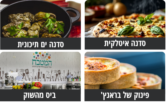 ![]() תשוקה המטבח הוקם מתוך תשוקה אמיתית ואהבה לאנשים ולאוכל. אנו מאמינים שכל מנה מנצחת מתחילה בחומרי גלם איכותיים, מתכונים מדויקים, ושיטות הוראה מתקדמות. המטבח מאובזר במיטב הטכנולוגיה הקולינרית. | ![]() מגוון ב'מטבח' תוכלו מגוון רחב של סדנאות בישול ואפייה המשלבות טכניקות ומתכונים ממטבחים ברחבי העולם. סדנאות בסגנונות שונים: אוכל איטלקי, אוכל יווני, אוכל גיאורגי, סדנת בראנץ' מפנקת, אוכל ערבי, סדנאות אפיה ועוד... |